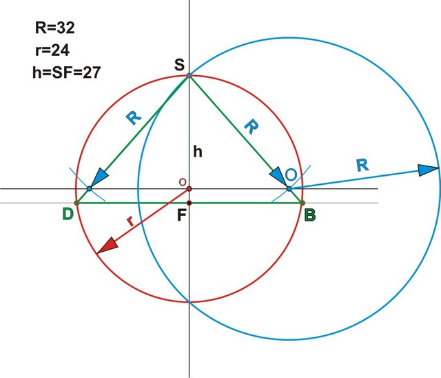 Пусть сторона основания равна а, высота пирамиды h, радиус описанной сферы пирамиды r, радиус сферы с центром в точке Q на ребре SB R, расстояние между центрами O и Q равно с, боковое ребро пирамиды равно b. (r^2-(a/2^0,5)^2)^0,5 + r = h (I) Заметим, что точки A,S,C принадлежат обеим сферам, линией пересечения сфер является окружность, проходящая через эти точки, следовательно, отрезок OQ перпендикулярен плоскости ASC, высоте h и параллелен диагонали DB основания пирамиды. Тогда с^2=R^2-r^2 = 8*7^0,5 (II) и из подобия треугольников HSB и OSQ (a/2^0,5)/c=h/r откуда a/2^0,5=ch/r (III) Подставив (III) в (I), имеем: (r^2-c^2h^2/r^2)^0,5 + r = h. После упрощения получаем: h=2r^3/(r^2+c^2)=27. |