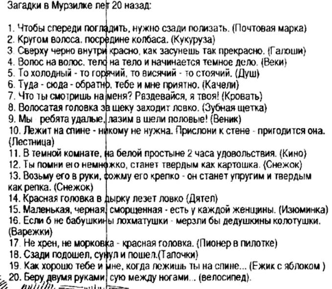 19. ..тебе хорошо. (уколбЯ) Если в таком духе продолжать, то и таких (загадок) не избежать: Три конца, два кольца, а посредине- гвоздик (еиксьлыбонреч ыцинжоН) |