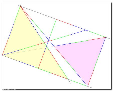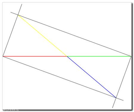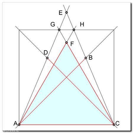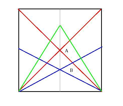 1. Строим квадрат угол по методу Balamut'a. 2. Чертим диагонали (красные линии) и отмечаем точку их пересечения (A). 3. Отмеряем на линейке произвольный отрезок длиной более отрезка, но меньше чем длина отрезка умноженная на корень квадратный из двух. Чертим два отрезка этой длины таким образом, чтобы один конец лежал на вершинах квадрата, а другой конец на другой стороне квадрата. Точка их пересечения обозначается B 4. Через A и В проводим прямую (серая линия), которая пересекает стороны квадрата посередине под прямым углом. Стало быть она является медианой/биссектрисой/высотой будущего треугольника. 5. Откладываются отрезки требуемой длины (зелёные линии) таким образом, чтобы один конец отрезка совпадал со сторонами квадрата, а другой лежал на прямой АВ 6. Всё готово. Надеюсь, такой вариант подойдёт. Признаю, что скорее всего есть более простые методы, но думать лениво. https://img.uforum.uz/images/uvawlsg7815876.jpeg |
