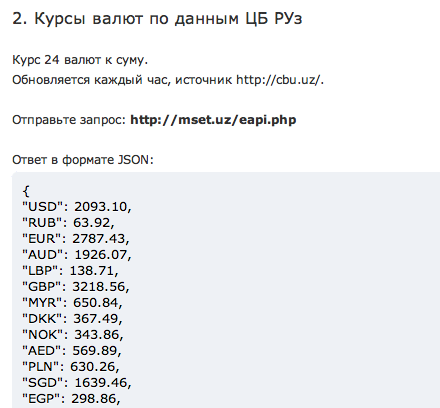 Руслан, прошу добавить, пожалуйста, сюда http://mset.uz/eapi.php вывод в формате json