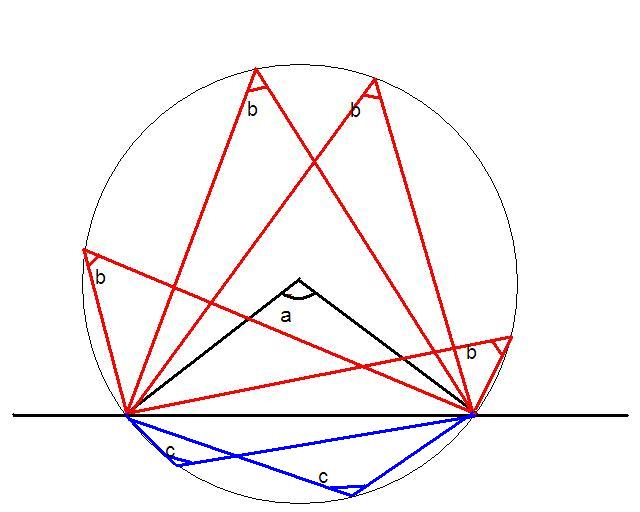 скрашу свое доказательство пояснениями :) всего возможны 2 случая -1 случай https://img.uforum.uz/thumbs/3908314.jpg очевидно ( и не просите меня отказаться от таких замечетельных слов...:parting2:)при увеличении расстояния от пляжа A<B<C угол равный половине угла образующегося отрезками соединяющими концы пляжа с центром окружности -будет уменьшаться -соответственно будет уменьшаться угол (если он существует) образующийся отрезками соеденяющими концы пляжа с точкой пересечения окружности с противоположным берегом -если противоположный берег будет являеться хородой, тогда углы в точках пересечения берега с окружностью будут равны и у нас появяться как минимум 2е (разные) "оптимальные" точеки -тогда мы можем конечно приблизить центр окружности к пляжу ,так что противоположный берег будет все таки иметь точку общую с окружностью, при этом угол просмотра увеличиться и очевидно максимальным углом станет угол просмотра пляжа в точке касания берега с окружностью. допустим существует еще одна (отличная от 1ой) "оптимальная" точка на противоположном берегу, тогда мы проведем окружность через нее и через оконечности пляжа, тогда очевидно, что ее радиус не должен равняться радиусу первой окружности т.к. в этом случае окружности будут совпадать и эта точка будет принадлежать ей, не может он быть и меньше поскольку такая окружность не будет иметь ни каких общих точек с противоположным берегом -значит радиус ее больше -в таком случае центр такой окружности будет более удален чем центр первой окружности а значит угол просмотра будет меньше -противоречие -2й случай представлен на рисунке https://img.uforum.uz/thumbs/8041531.jpg доказываеться похоже... Оффтоп: Цитата:
