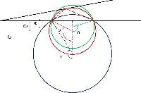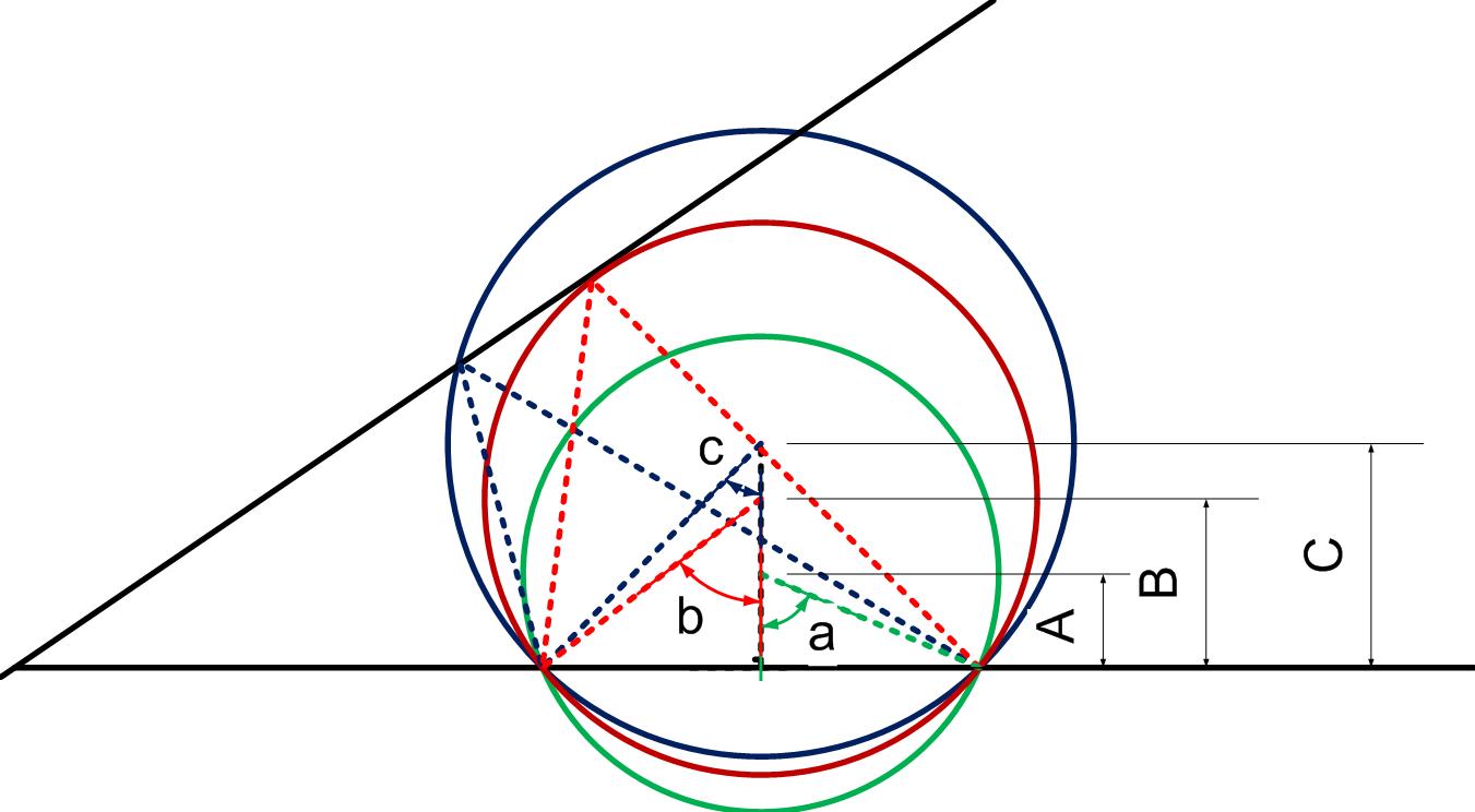 с другой стороны угол "б" образованый отрезками соеденяющими точку окружности с концами пляжа будет прямо пропорционально зависить от "а" т.е. угол "б" будет минимален/максимален тогда когда будет минимален угол "а" очевидно так же что решением задачи будет -касание окружностью противоположного берега:girl_sigh: с другой стороны -прийти самостоятельно к идее построения окружности для меня было бы не реальным...:017: |
