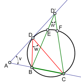 Построим окружность, проходящую через точки B и C и касающуюся противоположной стороны угла, обозначим точку касания D. Построим угол BDC. Возьмем на стороне угла AD произвольную точку D', отличную от D. Построим угол BD'C. Угол BDC равен половине дуги BC, а угол BD'C равен полуразности дуг BC и EF, следовательно угол BD'C для любой точки D' всегда меньше угла ВDC. https://img.uforum.uz/images/7441640.png |