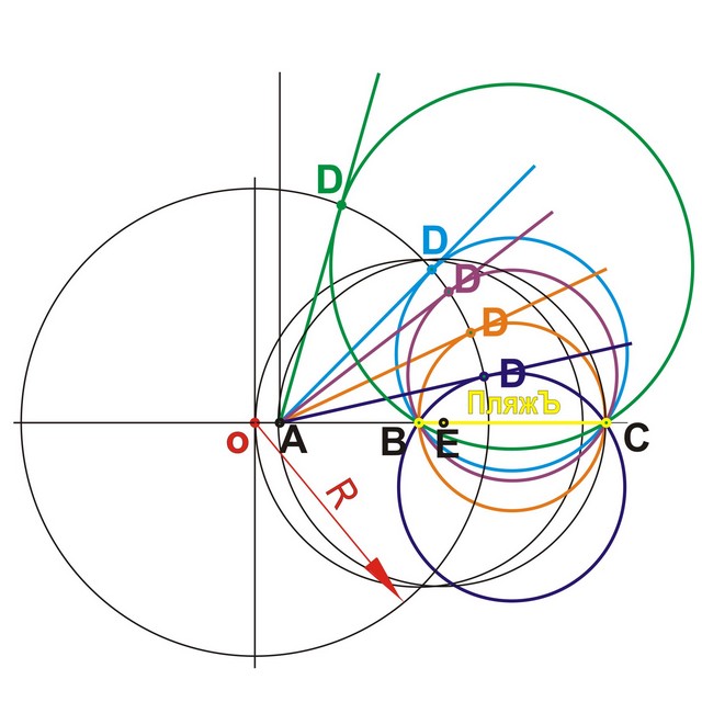 Ваш метод действительно позволяет построить искомую точку D - "оптимальную" (в терминологии модератора) точку касания. Для нее имеем: AD^2 =AB•AC (1) (свойство касательной) Покажем, что достаточно провести касательную из точки А к любой !(в том числе любой из "тех многих", которые вы любезно нарисовали) окружности, проходящей через точки B и C. Пусть точка D' - точка касания ( у вас они одинаково все обозначены через D и красиво разукрашены ). Тогда для нее по свойству касательной получим (AD') ^2 =AB•AC. (2) Из (1) и (2) имеем AD=AD'. Отсюда следует, что для нахождения оптимальной точки D достаточно отложить на берегу, не содержащему пляжа, отрезок длины AD'. |