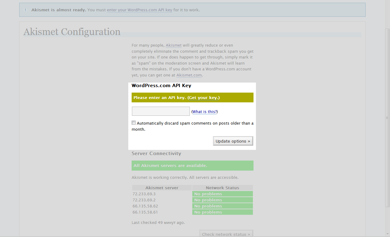 https://img.uforum.uz/thumbs/daiuwwb7636070.png Обновите страницу. После этого на вверху появится сообщение. https://img.uforum.uz/thumbs/plqdzjl6780826.png Перейдите по ссылке, указанной в ней. Теперь не много теории. Плагин работает как антиспам, и как у любого антиспама у него есть своя "база" сигнатур, к которой можно получить доступ с помощью API ключа. Его можно получить здесь. Для тех кому лень, или нет возможности, у нас есть свой ключ (API Key: b15fa116f166), но мы строго рекомендуем завести свой. После того, как у вас на руках есть ключ введите его в указанное поле. После чего плагин начнет свою полноценную работу. https://img.uforum.uz/thumbs/cwwdfxx4952442.png |