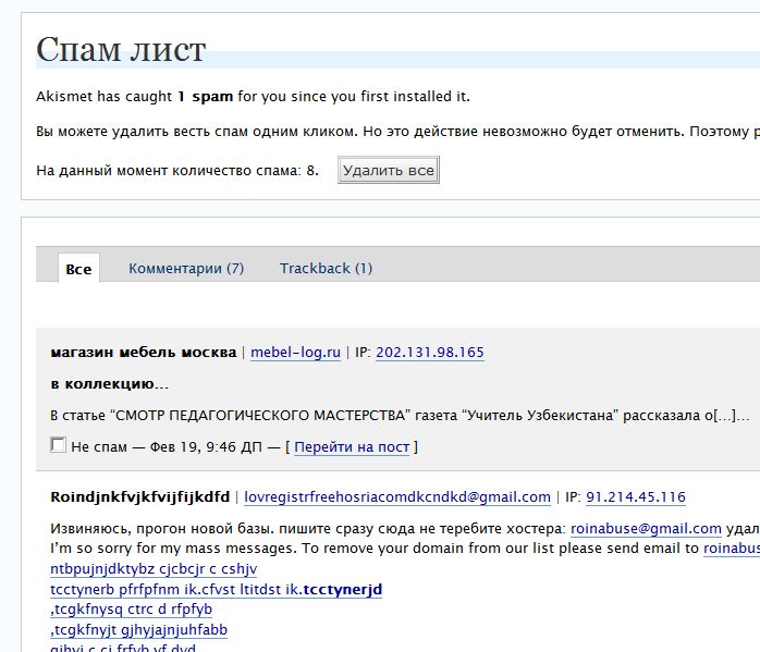 Плагин Akismet уже проверили, сейчас он работает на трех наших сателлитах. Понаблюдали мы за ним, вроде не плохой плагин (тока со своими плюсами и минусами). Следовательно его и будем ставить. Когда? Дополнительно сообщим. |