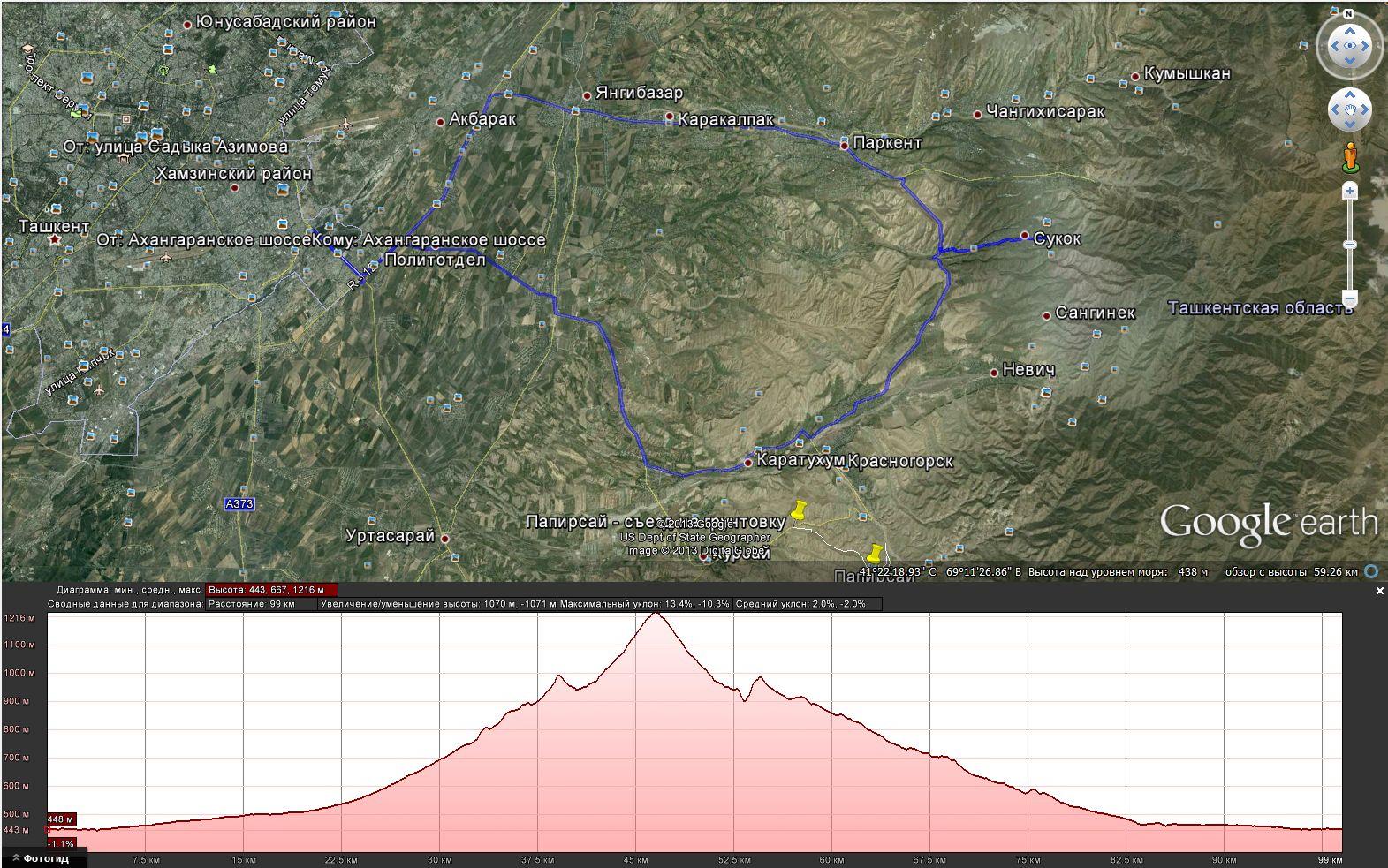 Погода - жарко . В Ташкенте обещают +38 днем, в Сукоке наверно будет около +32 +34.Старт - 07:00, остановка за рохатским кольцом. Дистанция - 99 км. Набор высоты - 1070 м. Покрытие - асфальт. Заезжаем с утра в Сукок, обедаем шашлыком и шурпой, валяемся на топчане, гуляем в лесхозе (если впустят). Возвращаемся по дороге через Кангли-Джумабазар-Политотдел. Маршрут: Рельеф: Трек во вложении. Последний раз редактировалось Zafar Babaev; 30.05.2013 в 14:57. |