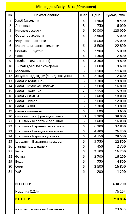 ![]() Спасибо, буду предельно конкретным! Строка 15 Меню "Салат - Золушка" был указан в количестве 2 шт., следует читать 6 шт. Всё остальное надеюсь теперь становится понятным?