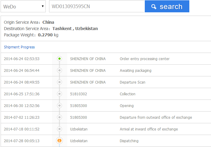 две посылки были отправлены при помощи WEDO или как на али называется Seller's Shipping Method. Посылки идут почти месяц.