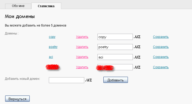 Максимальное количество доменов 5. Можно удалять и добавлять домены, а также изменять названия уже имеющихся.