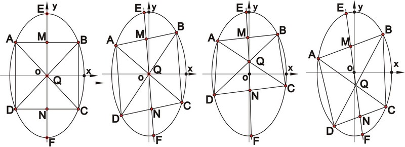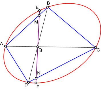 Точка Q пересечения диагоналей вписанного в эллипс четырехугольника ABCD делит пополам хорду EF эллипса. EF пересекает стороны AB и CD четырехугольника в точках M и N соответственно. Можно ли доказать, что отрезки MQ и NQ равны?