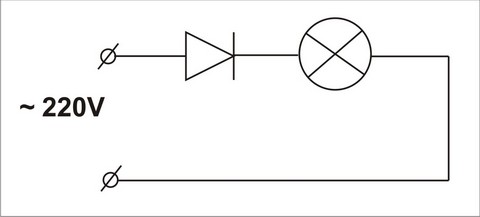 Вот тебе диод. Он будет пропускать пол-периода тока, экономяя тебе эл.энергию и расходы на замену перегоревших ламп. В цепь включается последовательно с лампой, без разницы с какой стороны и, без разницы, анодом или катодом к лампе. Правда, лампа будет гореть, при этом, в полнакала.