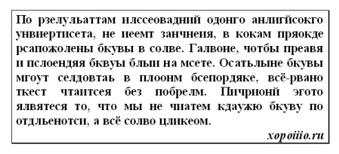 Оффтоп: Круто! Прочел все бегло, не понял сначала в чем прикол, внимательно стал читать повторно, и только тогда заметил, что каша из букв фактически. ![]() Наверное этим же вызвано то, что собственные опечатки в набранном тексте найти практически не возможно, вечно их пропускаешь, а редактор, например, обязательно находит, глянув свежим взглядом. ![]() |