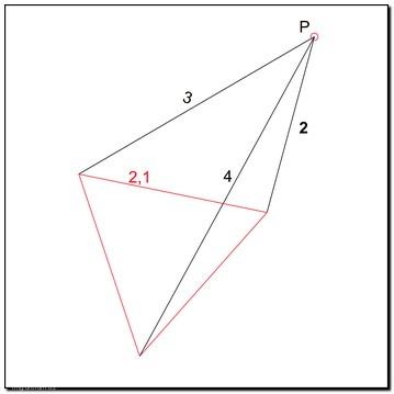 Если вне, то можно воспользоваться операцией, называемой обратным ходом: взять четырёхугольник ABCP и вычислить его неизвестные стороны. Я доказал с помощью неравенства треугольника, что в этом случае диагональ PC равна 4. Если внутри, расположение отрезков не имеет значения, можно применить формулы и найти. Найдя в числах, легко и построить. |