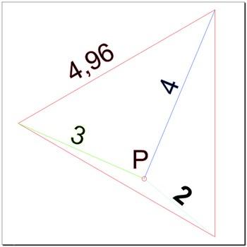 На плоскости дана точка P. Постройте равносторонний треугольник, одна из вершин которого отстоит от точки P на расстояние 2, вторая - на 3, а третья - на 4 (выбранных единиц длины).