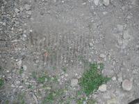 Товарищ турист после снятия рюкзака имел более менее равномерно мокрую спину и, соответственно, тельняшку. Проведенные 10 минут в положении "сидя в тени без рюкзака" привели к неравномерному высыханию тельняшки, представляющей собой ткань из чередующихся черных и белых полосок. Черные, поглощая больше тепла из атмосферы и попутно обдуваясь ветерком, должны высохнуть несколько быстрее, нежели белые. В результате энтого товарищ турист перед возлежанием на землю имел уже неравномерно мокрую тельняшку. В следствие физического взаимодействия тельняшки и земли мокрые полосочки безвозмездно поделились влагой с частицами грунта. Результатом сего действа стало проецирование мокрых полосочек тельняшки на грунт. Неравномерность ширины полосочек может быть вызвана различием подспинного рельефа местности и гигроскопичности материалов грунта. Кроме того, с 76,32% уверенностью могу предположить, что голова товарища туриста была дислоцирована в стороне, соответствующей левой части предъявленного фото, а опорная пятая точка - соответственно в правой.