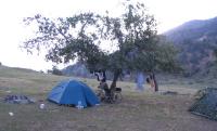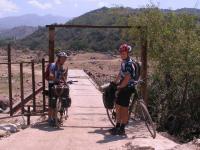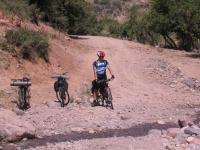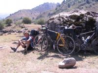 Выехал из Ташкента уже в полдень прямо с работы. А к Нурекате решил пройти.. да-да, именно пройти с велосипедом из Бельдерсая. Времени в обрез, поэтому до Бельдерсая ехал на машине. Подъем по лыжной трассе начал в 16-00. Через час был не перевале Четкумбель и еще через час спустился к Нурекате. Увидев первых отдыхающих (на ЗИЛе), спросил, не наблюдали ли они двоих велосипедистов. Отвечают: -"Нет. Мы давно здесь. Никого не было." Еду дальше, вниз по реке, всматриваюсь в берега в поисках палатки. Попутно обращаюсь к местным жителям с тем же вопросом, но никто не видел Вадима и Костю. Вдруг, замечаю палатки.. целых две! Но нет, это туристы, идущие с плато Пулатхан. Ребята предложили мне остановиться у них - ну, что ж, "солнце скроется, муравейник закроется" - с удовольствием принял предложение, поужинали, выпили отличного чаю с лимоном и свалились спать. Проснулись в шесть утра, взбодрились кофийком, подкрепились овсянкой, и я стартанул вниз по реке. Оказалось, что вчера не доехал до "наших" буквально две-три сотни метров. Ну, а дальше Вадим уже все рассказал. |