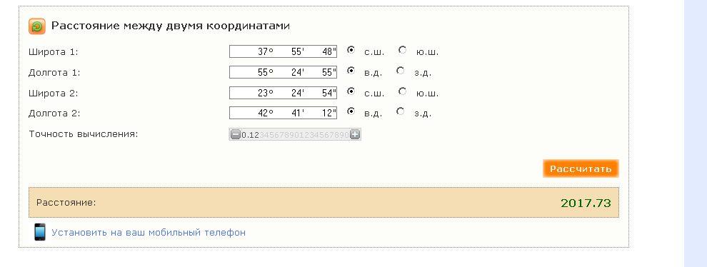 ![]() по онлайн расчетам расстояние примерно одинаковое +/- ![]() ![]() а вот в моих не ахти ![]() Книга2.xls |