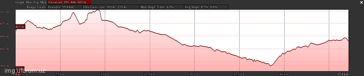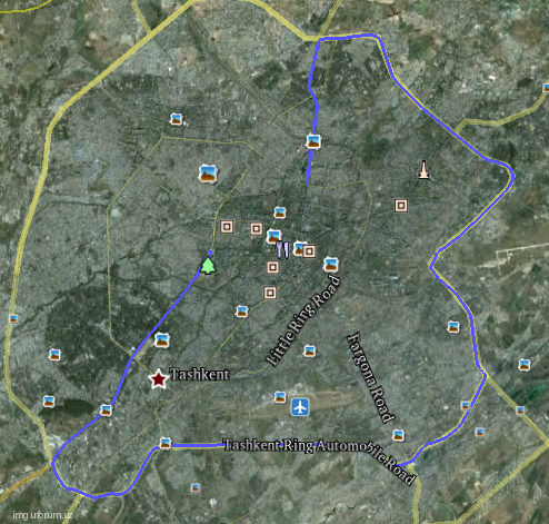 Всем привет! Судя по прогнозу погоды завтра (25 октября 2011 г.) дождя быть не должно. Посему хочу предложить вечером катнуть по новому еще не исследованному городскому маршруту. Из космоса выглядит он так: Стартуем от отеля Рэдисон (за мостом на геологоразведке) в сторону Юнус-Абада. Едем до поста Уч-Кахрамон, поворачиваем направо и по бетонке крутим до Абу-Сахий там на развязке сворачиваем в город. конечная точка маршрута Дворец Дружбы Народов. Всего получается ~56 км. Высотный профиль вот такой: Технически: первые 15 км. подъемы-спуски с общим набором высоты. Следующие ~30 км. спуск. и остаток до Дружбы небольшой подъем. Те кто хочет и может поехать, давайте решим во сколько старт - я предлагаю 19:00 или 19:30.