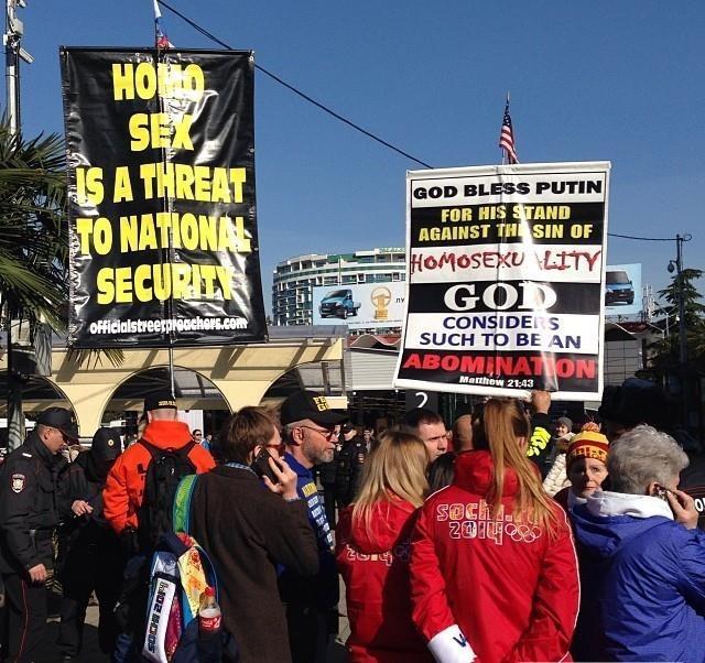 Внезапно...Американцы в Сочи устроили пикет. На плакатах написано: "Боже, благослови Путина за то, что он противостоит греху гомосексуализма" и "Гомосекс-угроза национальной безопасности".