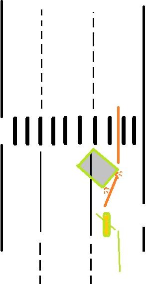 ![]() Матиз начинает движение передо мной, я понимаю что не успею затормозить и выбираю траекторию объезда Матиза справа, при этом рассчитывая что он продолжит движение. Но матиз резко останавливается, в результате чего я бью его в багажник.