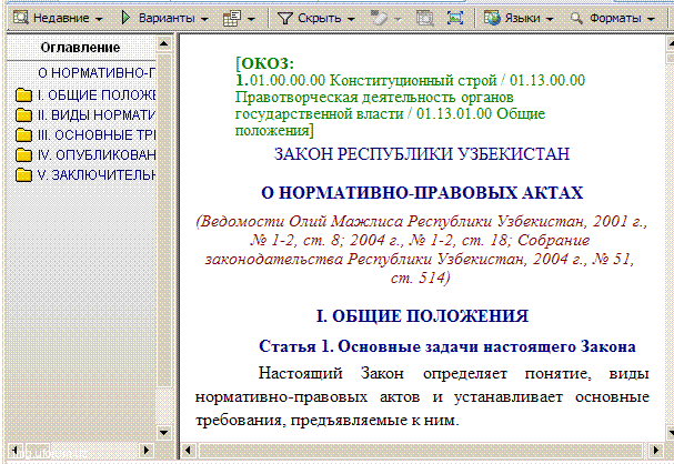 в соответствии статьи 25 Закона РУ "О НОРМАТИВНО-ПРАВОВЫХ АКТАХ" "... Официальными источниками опубликования законов Республики Узбекистан, постановлений палат Олий Мажлиса Республики Узбекистан, указов Президента Республики Узбекистан являются «Ведомости палат Олий Мажлиса Республики Узбекистан», «Собрание законодательства Республики Узбекистан», газеты «Халк сўзи» и «Народное слово». Официальными источниками опубликования постановлений Кабинета Министров Республики Узбекистан являются «Собрание постановлений Правительства Республики Узбекистан», «Собрание законодательства Республики Узбекистан», газеты «Халк сўзи» и «Народное слово». Официальными источниками опубликования нормативно-правовых актов министерств, государственных комитетов и ведомств Республики Узбекистан являются «Собрание законодательства Республики Узбекистан», официальные издания министерств, государственных комитетов и ведомств. ..." К вопросу об использовании кодов присвоенных к актам в системе LexUz. Данные коды присваиваются в соответствии с Общепровавым классификатором отраслей законодательства и могут быть продублированы для присвоения кодов актам на бумажных носителях. |