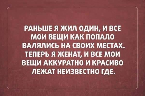 вначале брака я задолбался спрашивать где мои носки.. как ни спросишь, то ответ: постирала. на улицу вышел мусор выбросить, вернулся, снял носки.. и постирала.