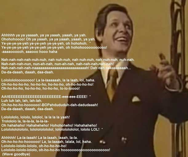 Curante parafini daravento primavera, (Эта история произошла много лет тому назад, пьянящей весной,) j'ai suis a la del country - Pedro Tarantas. (с обычным парнем из русской деревни, которого звали просто Педро.) garanto damages furtuapai caballero, (Он страстно полюбил красивую девушку из соседней деревни,) jujaga amgaziga j'ai vrai smoking Ganjibas. (а боялся признаться ей, что влюблен.) Magistro de l'amouro штанген-циркуль chleno-mero, (Однажды ночью, когда он задумчиво возвращался с дискотеки,) fuck off, my little baby and good bye. (его окликнул ее приятный застенчивый голос.) cherche la femme, где много un trajero. ("Не проводишь ли ты меня до дома, ковбой? - спросила она.) Piras pira at astra баю-бай. (- Мои родители уехали на симпозиум, и я боюсь ночевать одна".) He gets in many trouble cocaino. (И глупенький Педро с радостью согласился.) ich bin ya ya Volkswagen narcoman. (Пьянящий аормат любви со страшной силой ударил ему в голову.) and he was very very small kozlino, (На окрыленных ногах он последовал за своей возлюбленной,) he did pif-paf from his blach and big gun. (стреляя по пути папиросы "Беломорканал" у прохожих.) Ou, Pedro, ou-ou-ou-ooo, (Глупенький, глупенький несчастный Педро,) Au, Pedro, au-au-aaaa!!! (он находился в зависимости от наркотиков, которые принимал постоянно.) Einsturzen, toten hozen der finale - (Придя к ней домой, Педро скромно присел на кровать.) mein herr zuryuk di shelle hande hoh. (Красивая девушка, танцуя, медленно разделась и легла с ним рядом,) they make'in love con sexe vaginale, (и они страстно любили друг друга всю ночь напролет,) supositoria in rectum, o-oh. (а когда взошло солнце, они уже ничего не могли делать.) But yesterday his love рожать bambino, (А через 9 месяцев девуша родила ребеночка,) sindromo daunito hromosom (славного, но с небольшими умственными отклонениями.) was виноват proklianto cocaino, (Во всем были виноваты наркотики, которые принимал Педро,) stop narcota, efiro hloroform. (и, как позже доказали эксперты, порвавшийся презерватив.) And now his sorrow price is impotento, (Страшная кара постигла Педро - он ослеп,) his eng висит der вниз and не стоит... (его веки навсегда закрылись и никогда уже не поднимались...) good bye narcotics, drugs in un momento, (В порыве отчаяния Педро порвал с наркотиками,) но eng di все равно der не стоит. (но зрение к нему так и не вернулось.) Stop narcotics, narcomano sto-op! Последний раз редактировалось JH; 08.05.2010 в 09:57. |