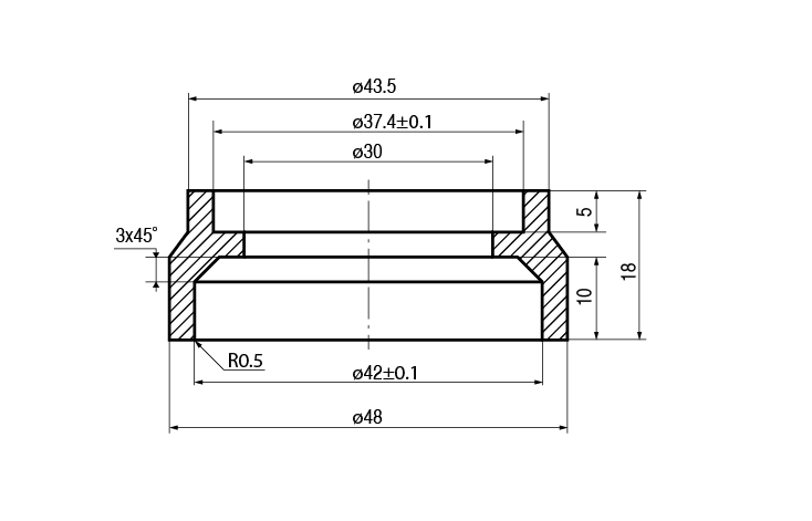 ![]() поехали. 1 - осевые и 2 размеры НАД размерной линией уже сказали. 3 - красными стрелками показаны линии которые должны быть такой же толщины как и контур так как они видимые. 4 - зеленая линия отсутствует, а ее видно. 5 - у вертикальных размерных линий размер пишется слева горизонтально (цифры на боку), всякие автокады могут делать как на чертеже, это нарушение ЕСКД. 6 - металл всегда штрихуется под 45 градусов, штриховые линии чуть тоньше контурной, заливки и другие штрихи не допускаются. Для дерева, резины, пластика и стекла есть свои штриховки. Далее конструктивно-технологические 7 - не указан радиус поднутрений, токарь спросит, ибо резца без радиуса не бывает. Надо указать например R0,5 тип. 8 - не указаны допуски, токарь не может сделать точно диаметр 37,4 — он должен знать насколько можно отклониться в плюс, насколько в минус, этот допуск ставится исходя из допусков на ответную деталь и требуемой конструкцией посадки соединения. Кстати, именно этот допуск и определяет на 99% стоимость работы. Допуски ставятся на «работающие» поверхности и надо указать как делать «свободные» поверхности, на них тоже бывает свой допуск. 9 - не указана шероховатость поверхностей, а токарь обязательно спросит. Надо указать шероховатость для рабочих поверхностей и для свободных. Рабочие намного «дороже» так как требуют ступенчатой обработки с припусками. В идеале токарь не должен ничего спрашивать видя чертеж, тут далеко не так. 10 - надо указать насколько допускается бочкообразность, конусность и некруглость (эллипсность) круглых поверхностей. В данном случае бочкообразностью и конусностью можно пренебречь, но эллипсность надо указывать. Иначе токарь может сварганить фигню и будет прав. 11.Хорош бы токарю дать чертеж этой детали в сборе с ответной, он бы сам сообразил бы что к чему.