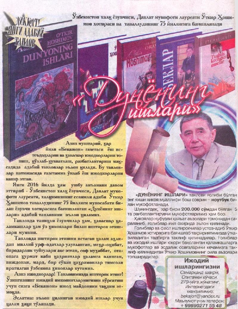 "Бекажон" газетаси халқимиз севган ёзувчи Ўткир Ҳошимов таваллудининг 75 йиллиги муносабати билан "Дунёнинг ишлари" танловини эълон қилишибди.