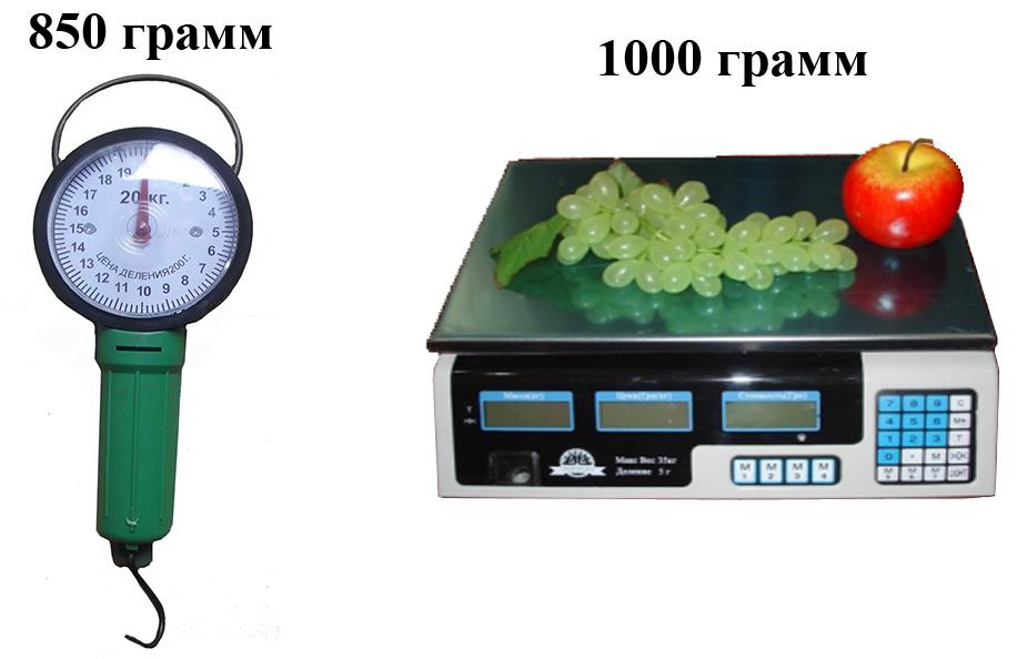Оба правильно показывают. Там, на ручных весах, прямо и написано:"точность деления 200г". Это означает, что точность измерения китайских ручных весов ±200г. Значит, когда показывает 850г, то реальный вес там может быть в пределах от 650г до 1050г. Другими словами, показания двух весов находятся в согласии в пределах ошибок измерений.