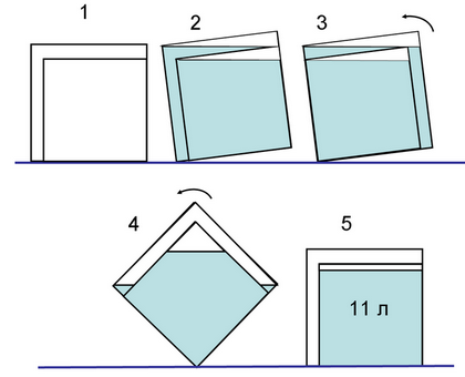 Положим малый куб в пустой большой куб отверстием не кверху, а влево (положение 1), днищем прижав его к правой стенке большого куба, и начнем заполнять водой систему. Наклоняя и подливая воды, добьемся положения 2. При этом вверху малого куба окажется 1 литр воздуха. Сдвинем в этом положении малый куб до упора его отверстия в левую стенку большого куба (положение 3) и продолжим опрокидывать систему против часовой стрелки (4). При этом вода из большого куба вытечет полностью, а в малом будет оставаться все время 11 литров (положение 5). Далее по известному плану. ![]() Расширением воздуха под действием столба воды высотой около 20 см пренебрегаем. Или не пренебрегаем?