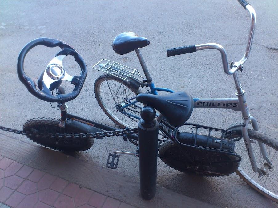 Мотоцикл, сделанный из переработанных материалов, из запасных частей автомобилей и велосипедов