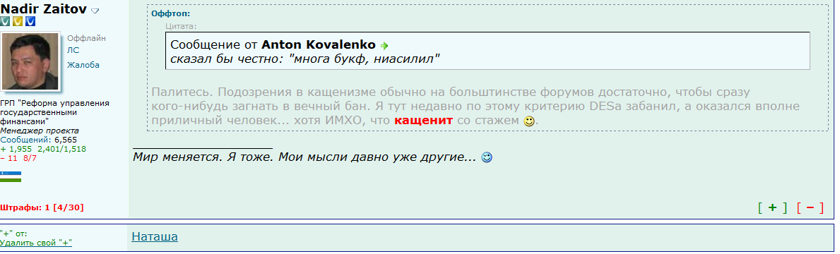 Даже если теперь окажется, что на форуме одни кащениты, ИМХО нужно ведь все равно что-то делать, как-то развиваться, приспосабливаться, может не нужно отбрасывать все подряд, может быть какие-то идеи даже прекрасно можно будет воплотить, может быть можно как-то всем вместе, не спеша, сделать наш форум лучше?