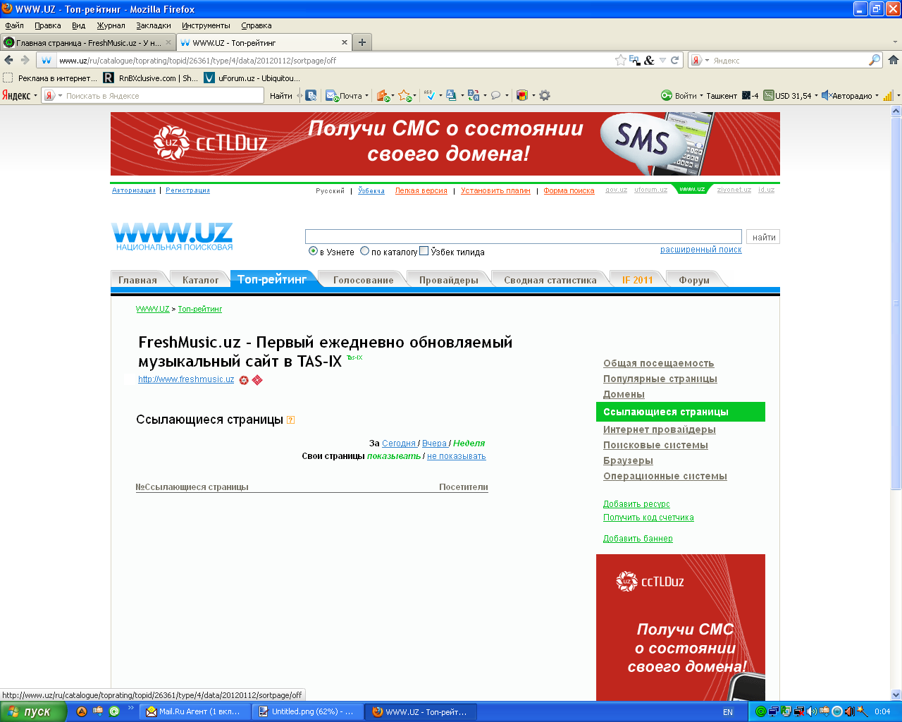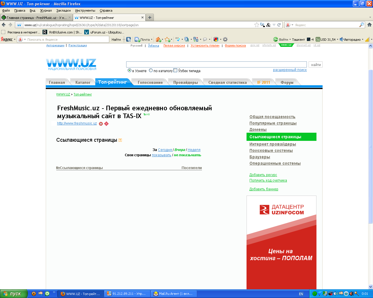Уважаемый Руслан Худяков! Данные о ссылающиеся на Ваш сайт страниц в 07.01.2012 года с 00-00 по 04-30 были неправильны вписаны в БД, в связи с неправильной передачи уникальных id во время обработки таблиц за текущего дня. Поэтому разные домены отображаются у Вас в недельной списке. На данное время такой bug был уже исправлен. Также прошу Всех, если Вы заметите что www.uz показывает страницу с содержанием "Сервер перегружен", а также если заметите когда на сайтах, где установлены наши видимые счётчики Ваша страница долго грузится дожидаясь счётчика с нашего сайта, прошу засечь время и отписаться об этом с указанием времени зависания сайта. С Уважением, Нишанов Максуд.