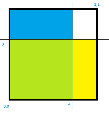 Допустим, Вам нужно подсчитать совместную вероятность 2-х событий. (в данном случае "попасть в цель из пушки А или B"). 1-я пушка (А) стреляет и попадает в цель с вероятностью 80%, 2-я (B) - 70%. События можно считать независимыми (это когда результат выстрела одной пушки не связан с результатом выстрела второй пушки, я делал лирическое отступление, что пушки могут друг-другу мешать в стрельбе). Для независимых событий P(A*B)=P(A)*P(B) - это тот случай, который я бы с ходу не стал объяснять детям без подготовки. Т.е. вероятность что оба снаряда попадут в цель равна произведению вероятностей, что в цель попадет соответствующая пушка. Взрослым объяснить можно, например по картинке: ![]() Площадь желто-зеленого участка - это вероятность события A Площадь сине-зеленого участка - вероятность события В Площадь зеленого участка - вероятность одновременного попадания из обоих орудий. Наша цель подсчитать площадь трехцветного участка -желто-зеленого-синего, т.е. что попадет хоть одно орудие (p(A+B)). А ее можно подсчитать разными способами. P(A+B) = P(A) + P(B) - P(A * B) (4) P(A+B) = P(A) + P(B) (1 - P(A * B)/P(B)) = P(A) + P(B) (1 - P(A)) (1) P(A+B) = P(B) + P(A) (1 - P(A * B)/P(A)) = P(A) + P(B) (1 - P(A)) (2) P(A+B) = 1- P((1-B)*(1-A)) = 1 - (1-P(A))*(1-P(B)) (3) кстати - (4) - это 4-я формула из теории вероятностей дающая результат . Потому и поставил номер 4, а не по-порядку.