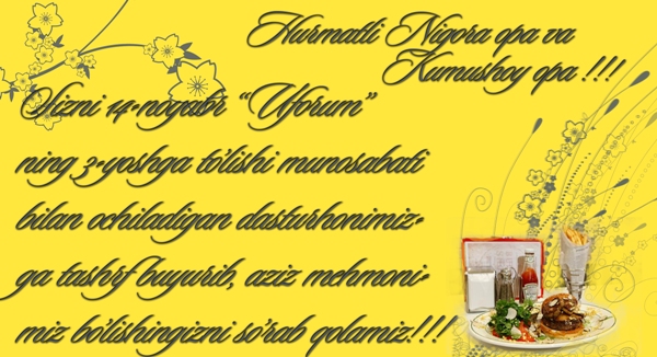 Zarhal taklifnoma uchun rahmat. Taklifnomani olgan inson borsa ham boradi, bormasa ham boradi. Biroq ikkla yig'ilishga ham bormaymikan deb turibman. Sababi alohida-alohida yig'ilishimiz yoqmayapti. Agarda Sizlar ham yigilishda jamlashsangiz qatnashardim... Birga yig'ilaylik, nima deysizlar, ukajonlarim. |