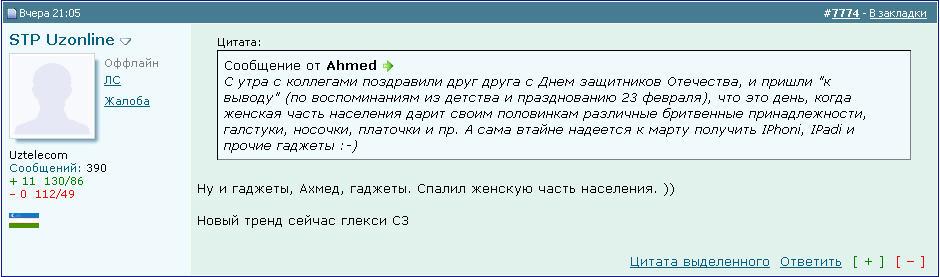 С утра с коллегами поздравили друг друга с Днем защитников Отечества, и пришли "к выводу" (по воспоминаниям из детства и празднованию 23 февраля), что это день, когда женская часть населения дарит своим половинкам различные бритвенные принадлежности, галстуки, носочки, платочки и пр. А сама втайне надеется к марту получить IPhoni, IPadi и прочие гаджеты :-)